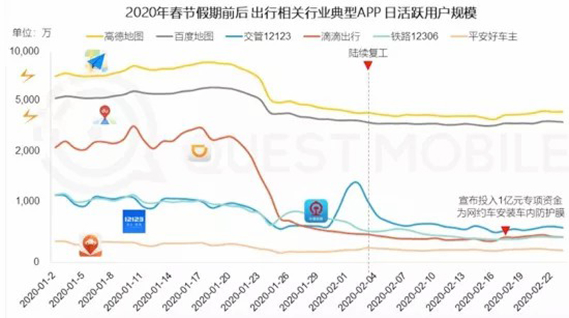 根據(jù)Questmobile數(shù)據(jù),滴滴日活用戶從疫情之前的超2000萬下降到不足500萬——同樣下降的還有高德、百度等地圖應用。