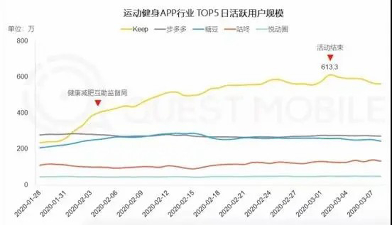 而根據(jù)Questmobile的數(shù)據(jù),Keep的日活從200多萬增長到了最高613.3萬,增速極其明顯——這和它主打室內(nèi)運動的特點有直接關系,咕咚等以室外跑步的APP就沒有那么幸運了。